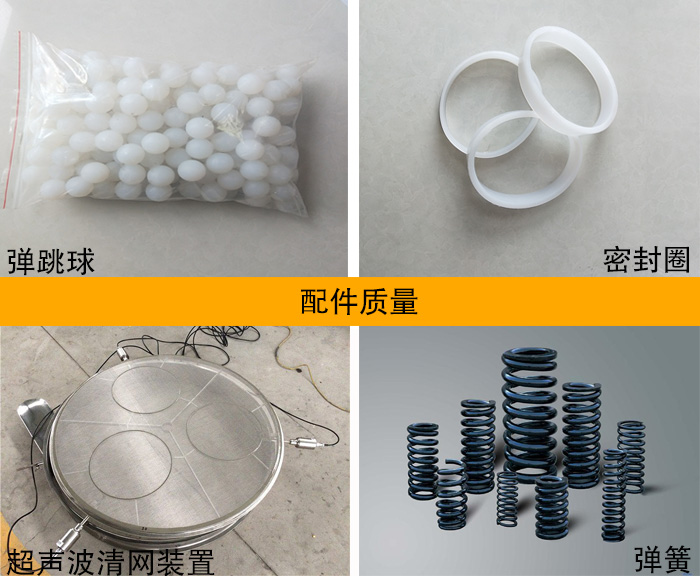 振動篩的配件有振動電機、減震彈簧、密封圈、清網(wǎng)裝置等。配件的質(zhì)量也是衡量振動篩優(yōu)劣的重要方面。我們以常見的彈跳球清網(wǎng)裝置為例,彈跳球的材質(zhì)可分為橡膠和硅膠兩類,根據(jù)不同物料選用不同的材質(zhì),一旦使用的配件不是正規(guī)匹配的,在使用過程中就會出現(xiàn)清網(wǎng)不理想,對物料產(chǎn)生二次污染等問題。