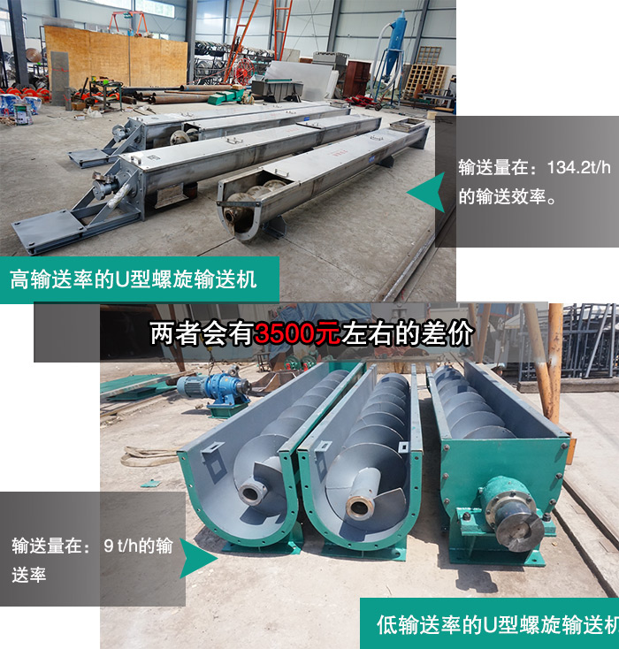 (2)低輸送率的U型螺旋輸送機是一些,家庭使用的小型的U型螺旋輸送機,其輸送量在:9t/h的輸送率,其高輸送量的螺旋輸送機相比低輸送量價格會高出3500元左右的差價。