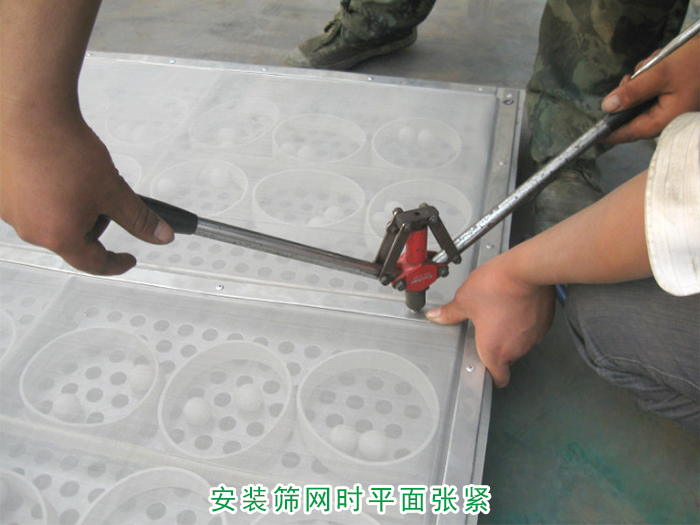 如果篩網(wǎng)沒有張緊,在設備運行過程中,高幅度的振動會引起篩網(wǎng)顫動,通常沿篩網(wǎng)邊緣或包邊壓條處斷裂或損壞,同時由于篩網(wǎng)未張緊,篩面水平度不夠,容易使篩網(wǎng)產(chǎn)生變形,物料易在某一位置產(chǎn)生堆積,引起篩網(wǎng)受力不均,產(chǎn)生破損。