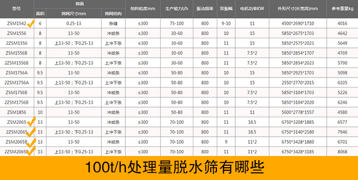 脫水篩中,型號眾多,以大漢脫水篩為例,其中處理量能達到100t/h的有以下幾種:ZSM1542,ZSM2065,2ZSM2065,ZSM2065B,2ZSM2065B等。具體參數(shù)如下: